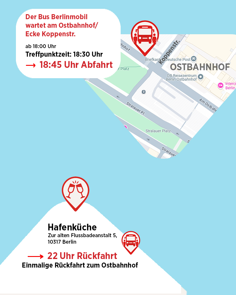 Der Bustransfer der Fa. Berlinmobil wartet neben dem Ostbahnhofgebäude/Ecke Koppenstraße → siehe nachfolgende Skizze, rote Standortmarkierung.